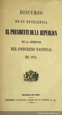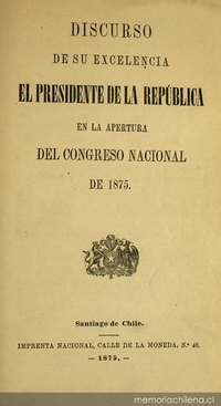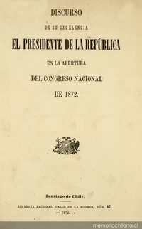 Discurso de su excelencia el Presidente de la República en la apertura del Congreso Nacional : 1871-1876. Santiago de Chile : Impr. Nacional, 1871 v. ; 33 cm. .
