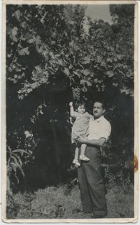 Patricio Ismael Contreras Vergara sosteniendo a un pequeño niño [Fotografía]. Chile : [Editor no identificado] , 1944. 1 Fotografía : Formato digital. .