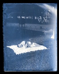 [Niño pequeño sobre una toalla en plaza Vergara] [fotografía]. [Viña del Mar, Chile] : [entre 1940 y 1950]. 1 fotografía : negativo sobre papel : 9 x 7 cm. .
