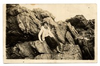 [Mujer en roquerío de un balneario] [fotografía]. [Chile] : [entre 1940 y 1950]. 1 fotografía : monocromo, gelatina sobre papel fibra ; 9 x 14 cm .
