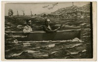 Mujer adulta con lentes oscuros, aparece en la fotografía junto a joven detrás de un bote donde se lee "Lucero" y que forma parte de un paisaje pintado en un telón de fondo utilizado por el fotógrafo minutero, en el que además se observa diversas embarcaciones y aviones, asi como una bahía y construcciones en una colina.