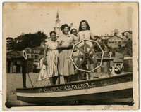 [Mujeres al interior de bote "El Caleuche-Cartagena"] [fotografía]. [Cartagena? : entre 1950 y 1960]. 1 fotografía : monocromo, gelatina sobre papel fibra ; 7 x 9 cm .