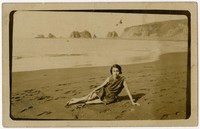 [Joven recostada en balneario] [fotografía]. [Chile : entre 1940 y 1950]. 1 fotografía : monocromo, gelatina sobre papel fibra ; 9 x 14 cm .