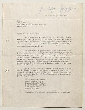 [Carta] 1971 abr. 5, Santiago, Chile [a] Hernán Santa Cruz [manuscrito] Carlos Albrech Viceros, Carlos Barella Iriart, Fernando Castillo Velasco, Fernando Kustnetzoff Katz, Héctor Valdés Phillips, Jorge Wong Leal.