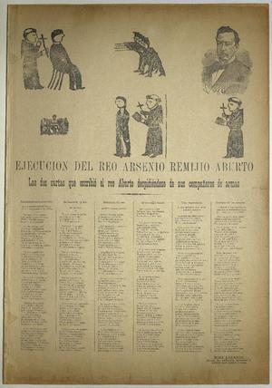 Ejecucion del reo Arsenio Remijio Aburto ; Las dos cartas que escribió el reo Aburto despidiéndose de sus compañeros de armas / Rosa Araneda. [Chile] : [Impresor no identificado], [1894?] 1 hoja : ilustraciones ; 56 x 39 cm. .