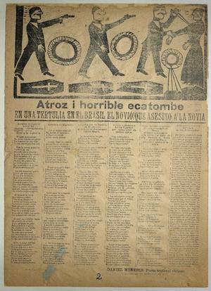 Atroz i horrible ecatombe en una tertulia en el Brasil : el novió que asesino a la novia / Daniel Meneses. Valparaíso : Imp. y Lit. de G. A. Rohde y Ca., [1902?] 1 hoja : ilustraciones ; 54 x 39 cm. .