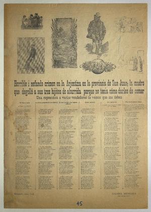 Horrible i nefando crímen en la Arjentina en la provincia de San Juan; la madre que degolló a sus tres hijitos de aburrida porque no tenia cómo darles de comer ; Una reprensión a varios vendedores de versos que me deben / Daniel Meneses. [Chile] : [Impresor no identificado], [entre 1890-1909] 1 hoja : ilustraciones ; 54 x 38 cm. .