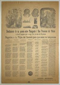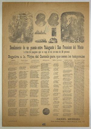 Hundimiento de un puente entre Talagante i San Francisco del Monte : i el tren de pasajeros que se cayó al rio con mas de 50 personas ; Rogativa a la Virjen del Carmelo para que cesen los temporales / Daniel Meneses. [Chile] : Imprenta Moneda, [1899?] 1 hoja : ilustraciones ; 55 x 39 cm. .