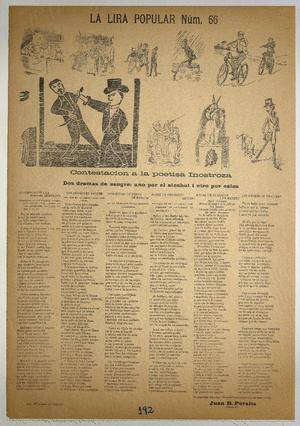 Contestacion a la poetisa Inostroza ; Dos dramas de sangre : uno por el alcohol i otro por celos : la lira popular núm. 66 / Juan B. Peralta. [Chile] : Imprenta "El Debate", [1903?] 1 hoja : ilustraciones ; 55 x 39 cm. .