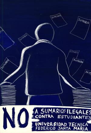 No a sumarios ilegales contra estudiantes Universidad técnica Federico Santa María / [estampa] : Nemesio Antúnez. Chile : Nemesio Antúnez, [1941 - 1993]. 1 cartel (afiche) : color ; 50 x 35 cm. .