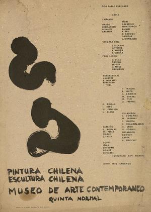Afiche de una muestra de pintura y escultura realizada en el Museo de Arte Contemporáneo en la que participaron distintos artistas chilenos .