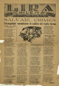 Salvaje crimen : extrangulado encontraron el cadáver del chofer Arenas. [Santiago, Chile] : [Editor no identificado], [1947?] ([Santiago] : Imprenta Varela) 1 hoja : ilustraciones ; 39 x 27 cm. .
