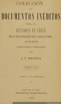 Colección de documentos inéditos para la historia de Chile : desde el viaje de Magallanes hasta la batalla de Maipo : 1518-1818 / colectados y publicados por J. T. Medina. Santiago : Impr. Ercilla, 1888-1902. 30 v.