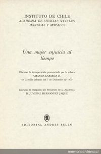 Una mujer enjuicia al tiempo : discurso de incorporación pronunciado por la Sra. Amanda Labarca H. en la sesión solemne del 7 de diciembre de 1970. Discurso de recepción del presidente de la Academia D. Juvenal Hernández Jaque. Santiago : Andrés Bello, 1971. 29 páginas. p. 5-17.